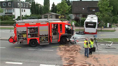 Un accident entre un bus et un véhicule du service d'incendie de Hambourg à fait 2 morts et 21 blessés plus ou moins grièvement atteints dont 5 pompiers.