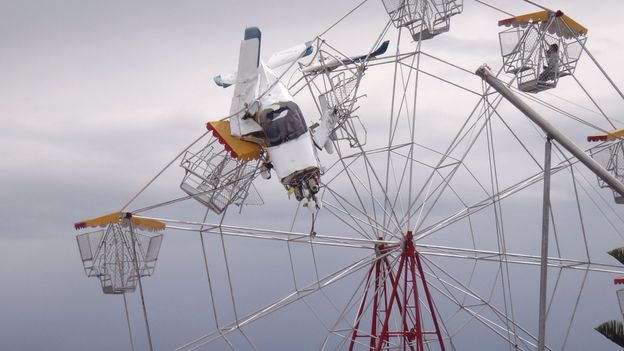 Un accident plus spectaculaire que dramatique s'est produit dans le petit village côtier d'Old Bar, dans l'Est de l'Australie. Le pilote d'un petit avion n'a pu éviter la roue dressée au milieu de la fête foraine.